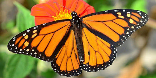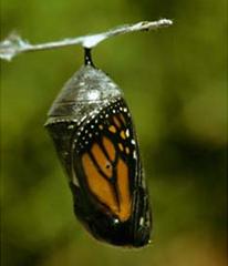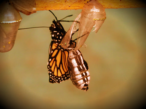 Borboleta-monarca (cerca de 8 cm a 12 cm de ponta a ponta das asas) saindo da fase de pupa.