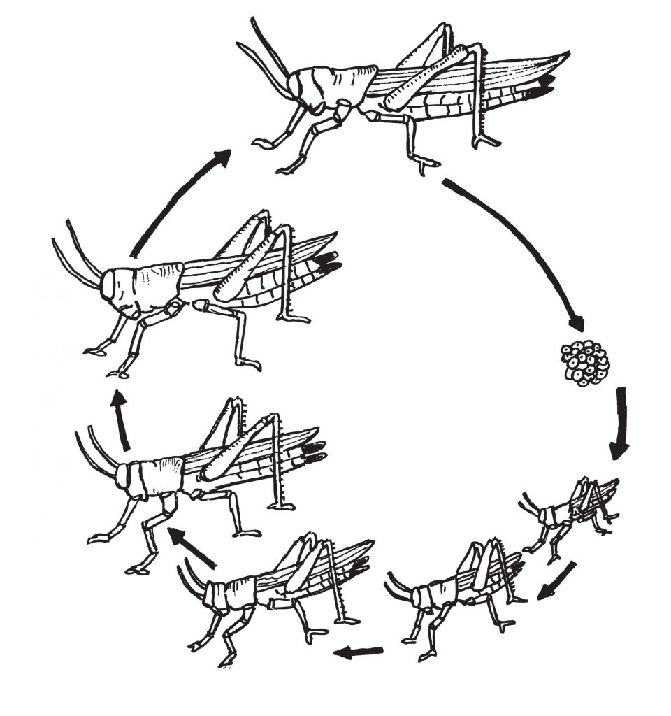 HEMIMETÁBOLOS: (hemi = meio) – a metamorfose é incompleta, isto é, o animal que sai do ovo difere pouco do adulto. Nos insetos hemimetábolos, como é o caso do gafanhoto, sai do ovo uma ninfa (filhote sem asas desenvolvidas), que sofre sucessivas mudas até chegar à forma adulta (com asas).