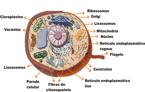 Célula vegetal: possui uma parede celular, em seu interior, em seu interior possui ribossomos, retículo endoplasmático granuloso, retículo endoplasmático não granuloso, complexo golgiense, cloroplastos, vacúolos de suco celular. O núcleo é envolto por um envelope nuclear, no interior há a cromatina, o nucléolo e o núcleo.