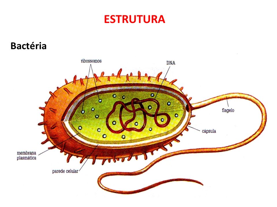 Bactéria: é envolta por uma parede celular e uma membrana plasmática, há mergulhado no citoplasma o DNA, organelas, ribossomos, plasmídeo, nucleóide. Há também flagelos em seu exterior.