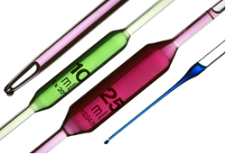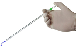 Utilizada para medição e transferência de volumes de líquidos ou soluções com menor precisão que as pipetas. Possui uma graduação no tubo de vidro, para marcação volumétrica comportado pelo vidro.